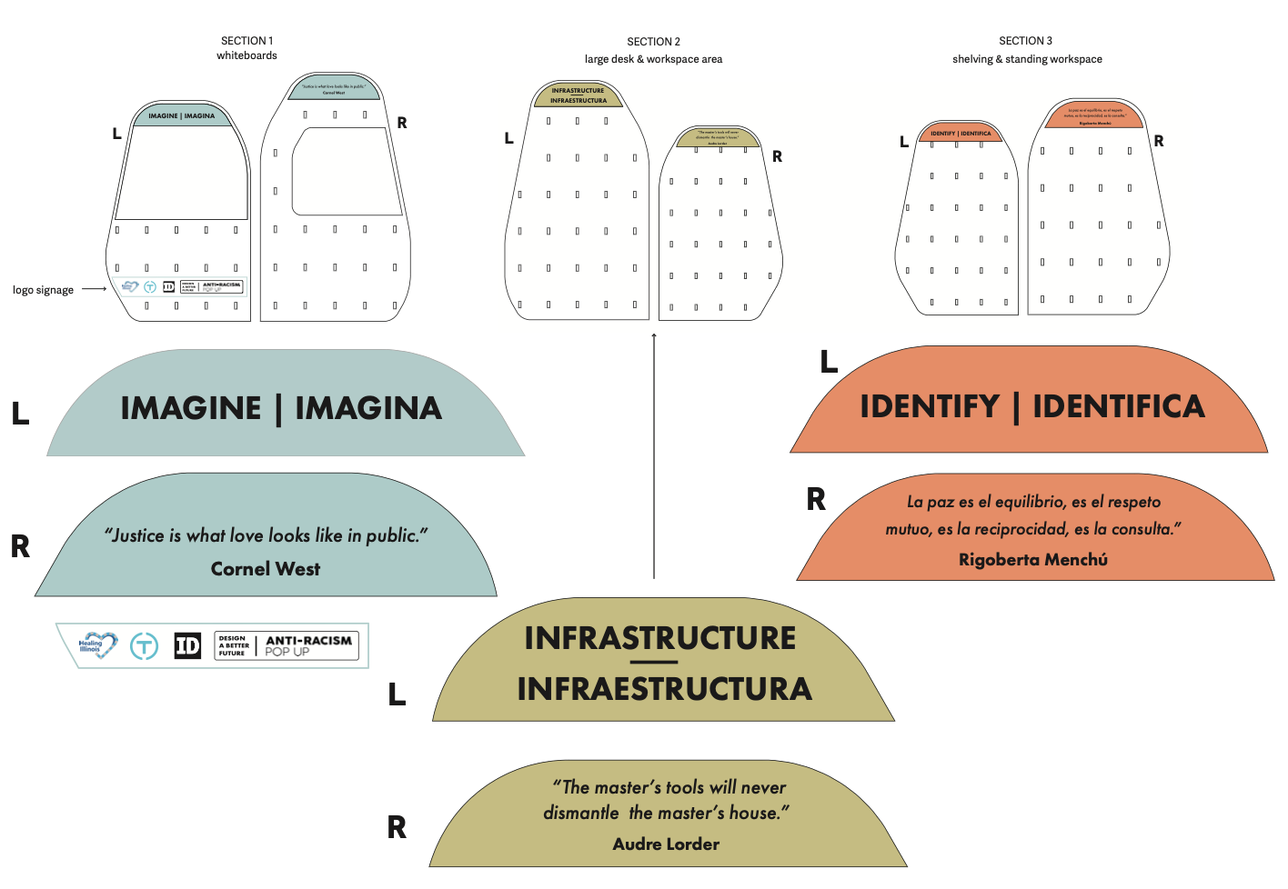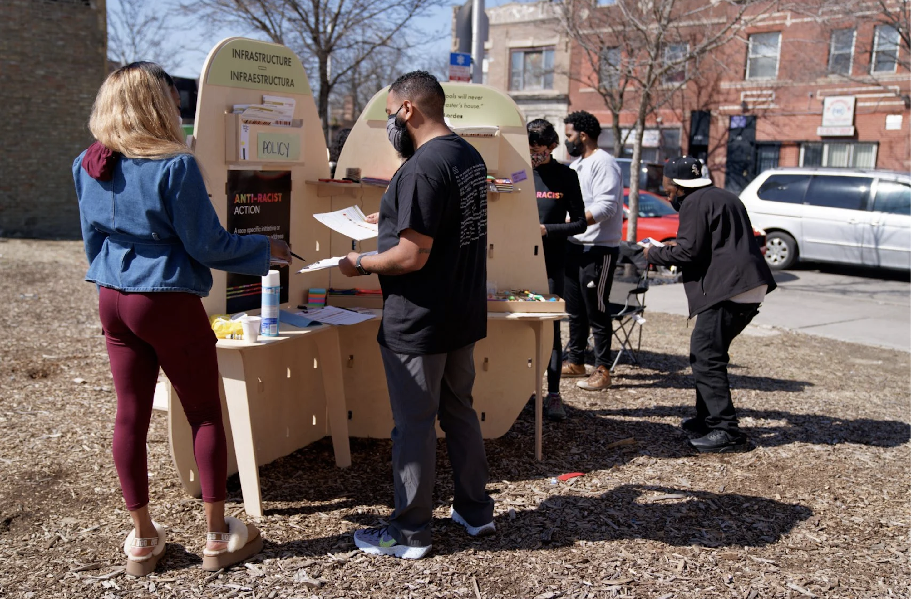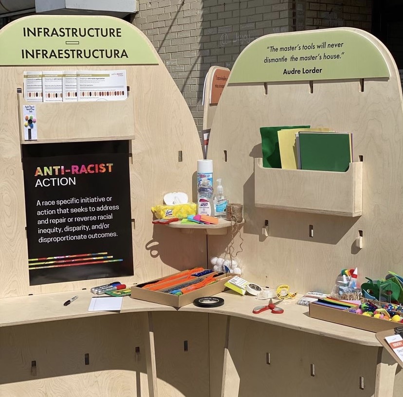 The Anti-Racist Pop-Up installation was an innovative project organized and facilitated by the Illinois Institute of Technology to create a physical structure for facilitating a multifaceted design workshop. The primary objective was to create a space that would enable people to come together and ideate in a safe, socially-distanced environment, while also accommodating all the necessary art supplies and sanitation equipment.